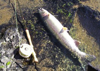 ![]() Approximate ten pound steelhead caught on 28 September in the "Camp Waters". Fish was released unharmed. |