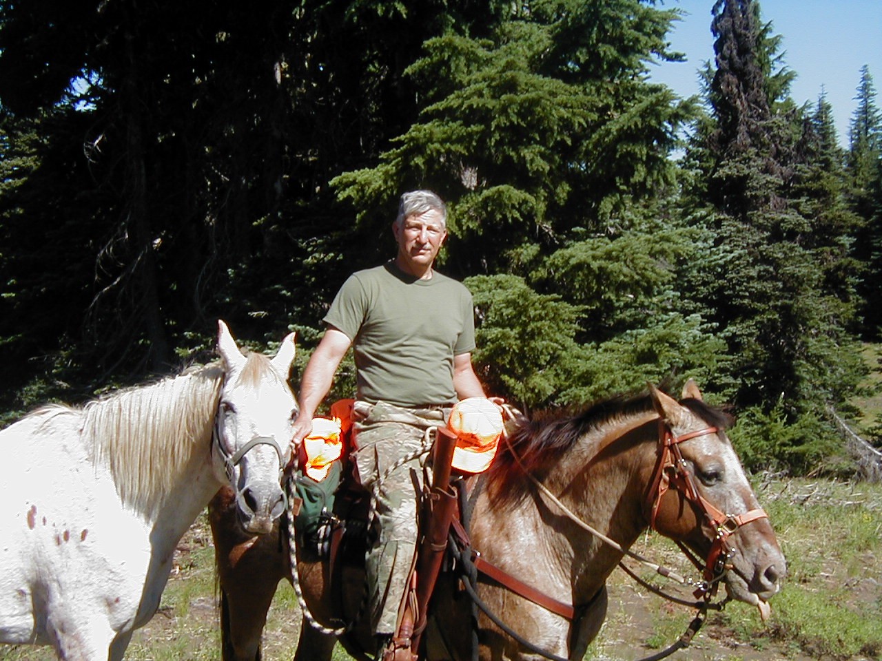 Andy riding Bubba and leading Cherokee on the slopes of Maxwell Butte.